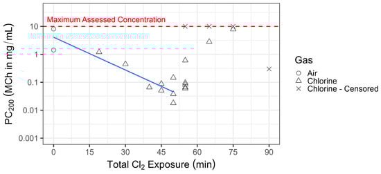 Chlorine inhalation exposure resulted in dose-dependent changes in airway responsiveness. Swine were exposed to 240 ppm chlorine gas (Cl2, n = 22) or room air (n = 2) via controlled ventilation for between 19 and 90 min. In surviving animals, at approximately 24 h post-exposure, lung resistance was measured following inhaled methacholine (MCh) challenge, and the provocative MCh concentration resulting in a 200% increase in lung resistance (RL)(PC200) was calculated. Animals for which RL failed to increase by 200% at the maximum MCh concentration (10 mg/kg) were censored. The data are presented with a linear fit (in blue) through the data points up to 50 min, with air-exposed animals representing an exposure of 0; at exposure times of 55 min or greater, PC200 values were not correlated with chlorine exposure.