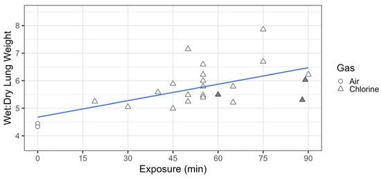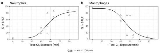 Wet-to-dry lung weight ratios were calculated as a measure of pulmonary edema. A linear fit through these ratio values by exposure time, with air-exposed animals representing an exposure of 0, demonstrated a statistically significant (p = 0.003) positive slope for wet/dry lung weight ratio by exposure time, suggesting a chlorine dose-dependent increase in pulmonary edema (Figure 4), consistent with published models of chlorine inhalation injury in rodents [,], rabbits [], and swine []. Chlorine exposure also resulted in a dose-dependent shift in airway inflammation, toward increasing percentages of neutrophils (Figure 5a) and decreasing percentages of macrophages (Figure 5b), based on four-parameter logistic curve fits to the data by exposure time. These results mirror pulmonary inflammatory skewing following chlorine exposure in mice and rats [,].