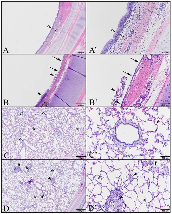 Chlorine inhalation exposure resulted in a gradient distribution of pathology along the respiratory tract. Swine were exposed to 240 ppm chlorine gas via controlled ventilation for between 19 and 90 min, and animals were euthanized at 24 h for necropsy and histopathology of respiratory tract tissues. Illustrative photomicrographs of trachea (series A,B) and lung (series C,D) are shown from an unexposed control (#7440; series A,C) and from an animal exposed for 19 min (#7443; series B,D). Low magnification (left column A–D via 4× objective; bar = 500 µm) and higher magnification (right column A’–D’ via 20× objective; bar = 100 µm) images are shown. (A,A’) Trachea, Control: images demonstrate unremarkable lining of ciliated respiratory epithelium (open arrowheads). (B,B’) Trachea, Chlorine-exposed: inflammatory cell accumulation (arrowheads) is present within the tracheal lumen, with an underlying area of ulceration (U) demonstrating adherent inflammatory cells and fibrin. Remaining degenerate epithelium (arrows) is markedly thinner than in controls. (C,C’) Lung, Control: small/lower airways (open arrowheads) are empty allowing unrestricted airflow to normal gas exchange areas of alveolar parenchyma (*). (D,D’) Lung, Chlorine-exposed: small/lower airways often contain debris composed of sloughed epithelium and inflammatory cells (arrowheads). Alveolar parenchyma (*) is largely within normal limits.