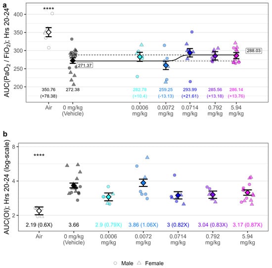 To evaluate efficacy of escalating treatment, one-way ANOVA was conducted on study endpoints, with post-hoc comparisons between results from each experimental group versus vehicle (with Dunnett’s adjustment for multiple comparisons). Endpoints were log-transformed prior to analysis where appropriate to stabilize variance in situations with high right-skew. For analyses of pulmonary function from post-exposure monitoring (PaO2/FiO2, OI, Cdyn, RL, Pplat, Pmean, Ppeak), analysis was conducted on the AUC for results obtained between hours 20–24 post-exposure. Focusing on a time range closer to the end of study provides adequate time for the compound to distribute and impact pathophysiology; utilizing the full AUC (0–24 h) dilutes the potential to observe efficacy. We chose the 20–24 h timepoints, as opposed to the single 24 h timepoint, to reduce the variability of data collected at a single timepoint. Note that calculated AUC was divided by the time taken to bring the values back to scale, akin to an average.