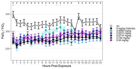 Chlorine exposure was associated with reduction in PaO2/FiO2 compared to air controls, but GSK2798745 treatment displayed only transient, inconsistent differences relative to vehicle. Yorkshire Swine were exposed to either 240 ppm chlorine gas or room air by intratracheal inhalation for 55 min. Following exposure, animals were treated with either vehicle or GSK2798745 by intravenous infusion (n = 6–16 per treatment group). PaO2/FiO2 was calculated hourly post-exposure for 24 h. Mixed-effects model estimates (diamonds) and standard errors are displayed for each dose group at each hour. Between-treatment comparisons to vehicle (Dunnett’s adjustment at each hour): # = p < 0.05 (versus air); * = p < 0.05 (versus GSK2798745 dose groups).