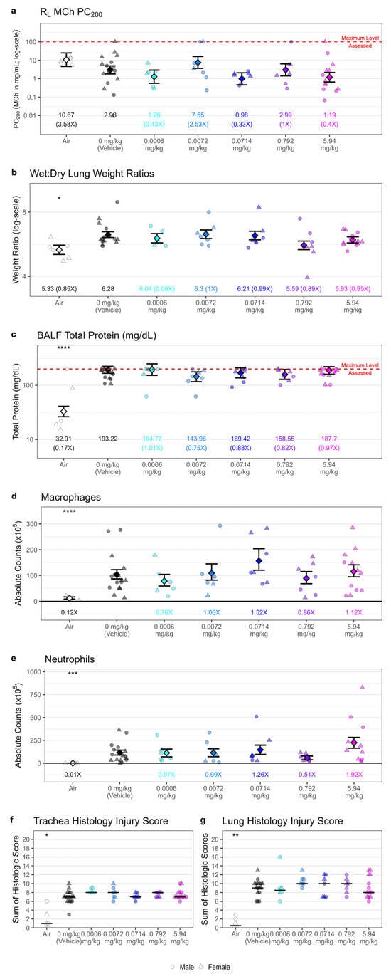 For histology results, scores for evaluations on the trachea and lung were summed and evaluated using a Kruskal–Wallis test for differences in distribution between groups, with Dunn’s post-test to compare experimental groups versus vehicle.