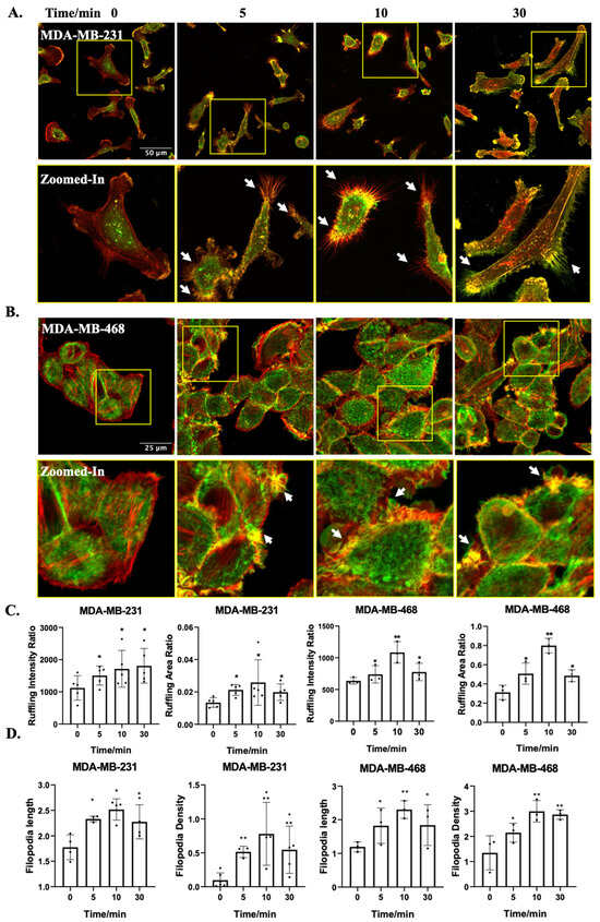 Firstly, we investigated the impact of OA treatment on TNBC cell morphology. OA treatment induced rapid cell membrane ruffling in both MDA-MB-231 and MDA-MB-468 cells (Figure 1A,B). Ruffling area and intensity were both increased, with peak responses at 10 min following the onset of OA treatment (Figure 1C). Moreover, OA-treated TNBC cells displayed prominent filopodia or filopodia-like protrusions (zoomed-in panels in Figure 1A, and Supplementary Figure S1). A quantitative assessment confirmed the substantial formation of filopodia, with increased length and density, particularly at the 10 min time point (Figure 1D). These findings underscore the dynamic and time-dependent alterations in cell morphology elicited by OA treatment in TNBC cells.