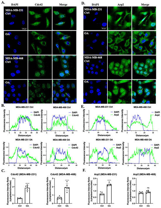 Considering the actin-rich cell protrusion changes induced by OA, we delved deeper into the mechanisms underlying these alterations, particularly focusing on the roles of Cdc42 and the Arp2/3 complex. These two molecular players are pivotal in orchestrating cytoskeletal dynamics, including the formation of filopodia and lamellipodia, respectively [23,49]. In both MDA-MB-231 and MDA-MB-468 cells, the localization of Cdc42 was primarily observed in the cytoplasmic and nuclear regions in the absence of OA treatment. Following OA exposure, a distinctive perinuclear distribution pattern of Cdc42 was observed (Figure 2A,B). The quantitative analysis unveiled an increased ratio of cytoplasmic to nuclear fluorescence intensity (Figure 2C), suggesting a dynamic translocation of Cdc42 in response to OA treatment. To locate the Arp2/3 complex, we labeled the TNBC cell with an antibody against its Arp2 subunit. In MDA-MB-231 cells, Arp2 exhibited a nucleus to cytoplasm translocation pattern following OA treatment (Figure 2D). However, this translocation was not as observed in MDA-MB-468 cells. Interestingly, MDA-MB-468 cells rather exhibited a reduction in Arp2 localization to the plasma membrane, with a greater proportion of Arp2 found within the cytoplasm (Figure 2E). Quantification further revealed an increased ratio of cytoplasmic to nuclear fluorescence intensity in MDA-MB-231 cells, but not in MDA-MB-468 cells (Figure 2F). Our findings underscore the involvement of Cdc42 in TNBC cell response to OA treatment, while the involvement of the Arp2/3 complex appears to be contingent on the cell line.