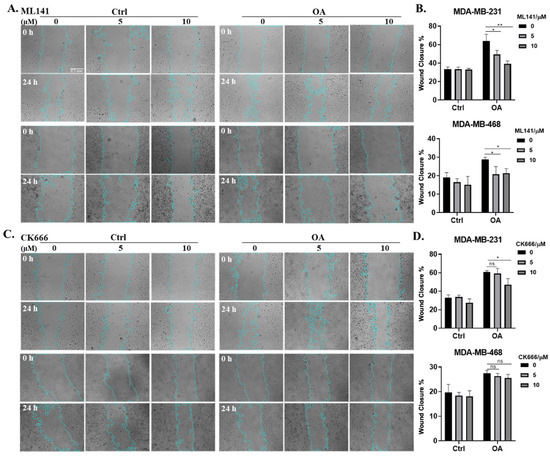 To gain a more comprehensive understanding of the interplay between OA and cell protrusions, and their combined impact on breast cancer cell migration, we conducted wound healing assays in the presence of the two distinct inhibitors for Cdc42 and the Arp2/3 complex (ML141 and CK666). The MTT assay results confirm the absence of significant cell toxicity induced by the inhibitors, as well as the absence of significant proliferation effects induced by OA under the experimental conditions in our wound healing assays (Figure S2). In both MDA-MB-231 and MDA-MB-468 cells, OA treatment promoted wound closure, confirming the pro-migratory effects of OA. Intriguing differences emerged when Cdc42 and Arp2/3 complex inhibitors were introduced. Treatment with ML141 had a significant inhibitory effect on OA-induced wound closure in both TNBC cell lines (Figure 4A,B). However, CK666 demonstrated a variable impact. It effectively inhibited OA-promoted wound closure in MDA-MB-231 cells, but only at a higher concentration (10 μM). In contrast, in MDA-MB-468 cells, CK666 had no effect (Figure 4C,D). Collectively, our results provide compelling evidence that Cdc42 activity is an essential requirement for OA-induced cell migration, while the contribution of Arp2/3 complex activity appears to be context-dependent, contingent on the specific characteristics of the cell line involved.