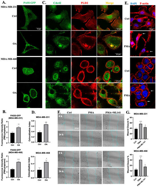 Our previous study reported that OA stimulated MDA-MB-231 cell migration in a PLD-dependent pathway, most likely PLD2 [48]. Therefore, we explored the potential involvement of PLD2 in OA-induced filopodia formation and cell migration signaling. Using a highly sensitive and specific phosphatidic acid (PA) sensor known as GFP-PASS, we confirmed that, in both MDA-MB-231 and MDA-MB-468 cells, OA activated PLD activity, as shown by the recruitment of GFP-PASS to the cell membrane (Figure 5A,B) [50]. We then examined the colocalization of Cdc42 and PLD2 in TNBC cells, revealing the colocalization on the cell membrane region of untreated cells. And OA treatment did not influence the expression of Cdc42 and PLD2 (Figure S3), while it prompted the translocation of Cdc42 from the nucleus to the cytoplasm, consequently increasing the degree of colocalization of the two proteins (Figure 5C,D). Much like the effect of OA, treatment with PMA (a strong PLD activator [51,52]) also induced filopodia formation in both MDA-MB-231 and MDA-MB-468 cells (Figure 5E). Our previous research already demonstrated that the inhibition of PLD activity effectively blocked the stimulatory effect of OA on cell migration [48]. Building upon this, we confirmed that the activation of PLD activity by PMA led to a similar stimulating effect on wound healing recovery in TNBC cells (Figure 5F,G). The wound closure-stimulating effect induced by PMA was effectively abrogated by ML141, signifying the indispensable role of Cdc42 activity in PMA-induced cell migration. Taken together, our results suggest that PLD activity is required for OA-induced Cdc42-dependent filopodia formation and cell migration in TNBC cells.