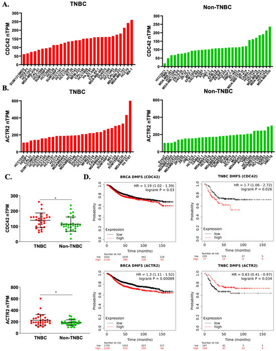 High CDC42 expression correlates with TNBC risks. (A–C) Gene expression profiles of human CDC42 and ACTR2 in a panel of breast cancer cell lines (from the Human Protein Atlas). Statistical significance was assessed by the Student’s t-test (* p < 0.05). (D) Kaplan–Meier survival plots of distant metastasis-free survival (DMFS) in breast cancer patients (all patients and TNBC subset) over a span of up to 180 months, based on CDC42 and ACTR2 expressions. “HR” stands for “hazard ratio”, and “log-rank P” refers to the p-value obtained from a log-rank test.