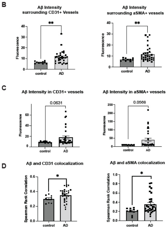 Extracellular deposition of Aβ is one of AD’s most extensively studied histopathological features. In addition to its presence within the brain parenchyma, Aβ deposition also occurs within the cerebrovasculature, leading to CAA in up to 98% of AD patients [1,5]. Aβ deposition was assessed using the pan anti-Aβ antibody D54D2 in conjunction with anti-CD31 staining for ECs or anti-αSMA staining for vascular SMCs (Figure 1A). The average intensity of Aβ staining fluorescence was quantified to reflect Aβ deposition within the stained regions and their adjacent parenchyma. In the parenchyma surrounding cerebrovasculature in AD patients, the mean Aβ deposition was significantly elevated around ECs compared to controls (control mean = 6.33, AD mean = 11.46, Z = −2.98292, p = 0.0029), as well as in the vicinity of SMCs (control mean = 6.81, AD mean = 11.82, Z = −2.83511, p = 0.0046) (Figure 1B), thereby confirming Aβ accumulation in the parenchyma of AD patients. Mean vascular Aβ levels showed an upward trend in AD patients (Figure 1C), although statistical significance was not reached in CD31+ area (control mean = 9.21, AD mean = 17,82, Z = −1.85847, p = 0.0631) and αSMA+ area (control mean = 9.57, AD mean = 40.55, Z = −1.90476, p = 0.0568).