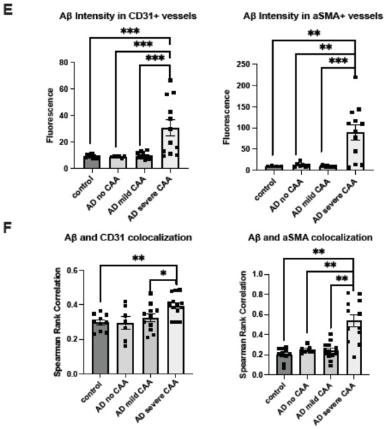 To further characterize Aβ deposition within the cerebrovasculature in AD, we extended the analysis to Aβ deposition in AD patients categorized according to CAA severity. Upon stratifying AD samples by the extent of CAA, escalated vascular Aβ deposition exclusively emerged in AD patients with severe CAA, but not those with no or mild CAA. This is evident in the mean Aβ intensity within the CD31+ area (H(3) = 19.18, p = 0.0003; mean control = 9.21, mean AD no CAA = 8.83, mean AD mild CAA = 9.51, mean AD severe CAA = 30.63) and αSMA+ area (H(3) = 17.92, p = 0.0005; mean control = 10.15, mean AD no CAA = 12.59, mean AD mild CAA = 9.74, mean AD severe CAA = 90.25) (Figure 1E). As expected, marked increases in vascular Aβ were observed in AD patients with severe CAA when compared to control patients (Z = 3.53, p = 0.0004) and those with no CAA (Z = 3.32, p = 0.0009) or mild CAA (Z = 3.32, p = 0.0009) in the CD31+ area. Similarly, significant increases in vascular Aβ in the αSMA+ area were seen in AD patients with severe CAA when contrasted with control patients (Z = 3.26, p = 0.0011) and AD patients with no CAA (Z = 2.58, p = 0.0099) or mild CAA (Z = 3.51, p = 0.0005).