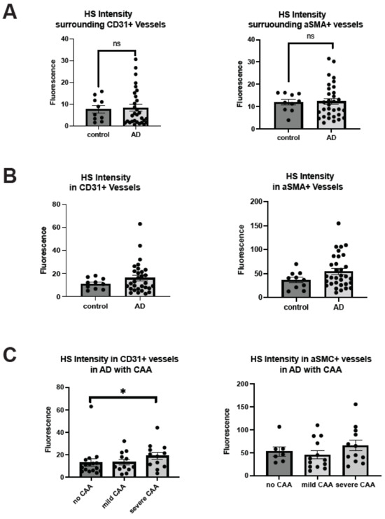 Bulk tissue analysis has determined that HS level is elevated in AD patients [24,25,49,50], but it remains unknown if HS level in cerebrovasculature is altered in the patients [33]. This was determined by the co-staining of HS and CD31 or αSMA. HS densities were not significantly changed in the parenchyma in patients with AD surrounding ECs (control mean = 7.74, AD mean = 8.30, Z = 0.48414, p = 0.6283) or surrounding SMCs (control mean = 6.80, AD mean = 11.82, Z = 0.32486, p = 0.7453) (Figure 2A). HS levels in the cerebrovasculature are also not significantly changed in AD either in EC (control mean = 11.24, AD mean = 16.07, Z = −0.67155, p = 0.5019) or SMC compartments (control mean = 36.49, AD mean = 54.36, Z = −1.28461, p = 0.1989), although there appear tendencies of increase in both compartments (Figure 2B). In the CAA-stratified subgroup analysis, the mean HS level in AD patients with severe CAA showed a significant increase in EC compartment (Z = 1.973013, p = 0.0485) when compared to the AD patients with no CAA (Z = 1.973013, p = 0.0485) (Figure 2C). Interestingly, mean HS in the SMA compartment was not significantly altered in AD patients among the CAA-stratified AD patients (H(2) = 2.6442, p = 0.2666), although the severe CAA group showed a tendency of increase.