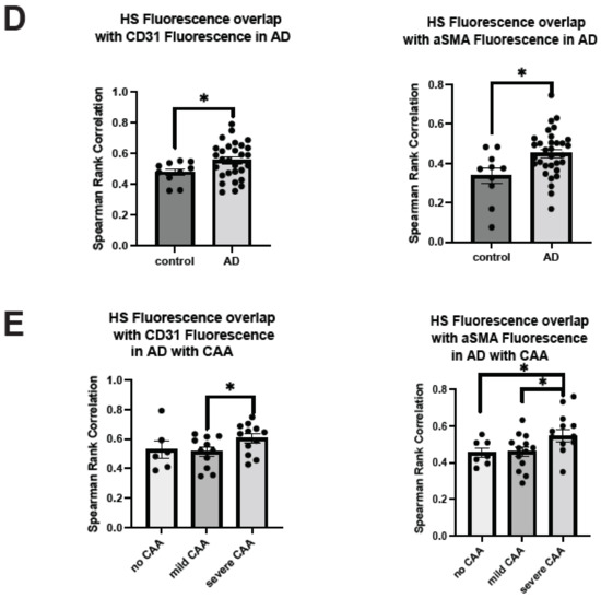 In parallel, we carried out HS and vascular marker colocalization analyses. When CD31 fluorescence was examined, its overlap with HS fluorescence significantly increased in AD patients compared to control subjects (control mean = 0.4326, AD mean = 0.51, Z = −2.28, p = 0.001) (Figure 2D), indicating that more ECs express or are covered with above-background HS in AD. Similarly, αSMA fluorescence and HS fluorescence overlap also increased in AD patients compared to control subjects (control mean = 0.34, AD mean = 0.45, Z = −2.41, p = 0.0161) (Figure 2D), indicating that SMCs express or are covered with above-background HS in AD. Mander’s coefficients revealed that HS overlap with above-background αSMA, not background CD31, is increased in AD patients (Figure S2A). When AD patients with varying CAA severity were grouped, CD31 fluorescence colocalization with HS was not significantly different between the no CAA and mild CAA subgroups (H(2) = 4.53, p = 0.1038, mean AD no CAA = 0.51, mean AD mild CAA = 0.48, mean AD severe CAA = 0.55) but significantly increased in the severe CAA group (Z = 2.06, p = 0.0392) (Figure 2E). Similarly, αSMA and HS colocalization were increased considerably based on the severity of CAA in AD patients (H(2) = 11.23, p = 0.0036, mean AD no CAA = 0.41, mean AD mild CAA = 0.39, mean AD severe CAA = 0.53). AD patients with severe CAA had a significantly increased overlap of HS and αSMA compared to patients with mild CAA (Z = 3.13, p = 0.0018) and no CAA (Z = 2.32, p = 0.0201) (Figure 2E). Mander’s coefficients indicate that the overlap of HS with EC and SMC channels was increased in the presence of severe CAA (Figure S2B). In summary, these data show that HS in the cerebrovasculature, in both EC and SMC compartments, is elevated in AD patients with severe CAA, revealing a positive correlation between HS level and CAA severity.