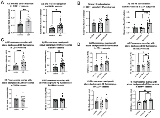 Upon examining the colocalization of HS and Aβ above-background levels using Mander’s M1 and M2 coefficients, we noted that Aβ fluorescence exhibited increased colocalization with above-background HS fluorescence in both EC and SMC compartments of AD patients compared to controls (Figure 3C). However, the overlap of HS fluorescence with above-background Aβ fluorescence remained unchanged in the presence of AD (Figure 3C). In the analysis of CAA subgroups of AD patients, Mander’s coefficients indicated that in the presence of severe CAA, Aβ fluorescence overlap with HS fluorescence increased in both EC and SMC compartments, while the overlapping of HS with Aβ was augmented only in the SMC compartment, not the EC compartment (Figure 3D).