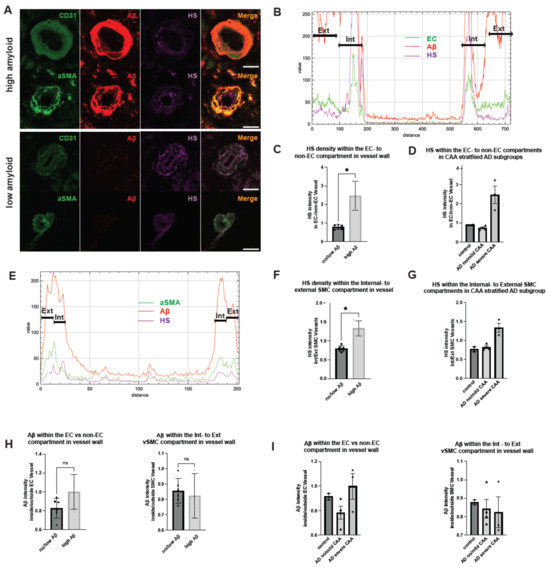 Figure 4. HS expression and Aβ deposition in different compartments within the cerebrovascular wall in AD. Representative images of cerebrovasculature with no/low and high CAA are stained for CD31, αSMA, HS, and Aβ (A). The immunofluorescence histogram analysis of HS staining in EC to non-EC compartments (BD) and the rations of the HS and Aβ staining in the internal (Int)- to the external (Ext) SMC compartments (EG). The immunofluorescence histogram analysis of Aβ staining in EC to non-EC compartments (H) and the internal to the external SMC compartments (I). The data are presented as mean ± SD. For significance results, * = p ≤ 0.05; ns, not significant. Scale bars = 25 µm. Jn CAA separated analyses, control patients are denoted with square, AD patients with no/mild CAA are denoted with triangle and AD patients with severe CAA are denoted with asterisk datapoints.
