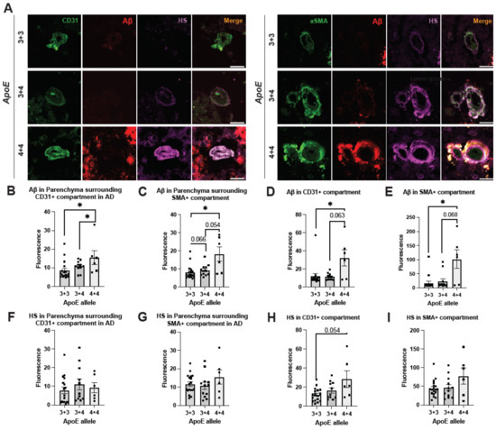 Figure 6. Cerebrovascular HS expression in AD patients with different ApoE genotypes. Representative brain tissue images depicting various ApoE genotypes, stained for CD31, αSMA, Aβ, and HS (A). Quantitation of Aβ- and HS fluorescence in the compartments surrounding ECs (B,F) and SMCs (C,G), as well as in the compartments of ECs (D,H) and SMCs (E,I), respectively. The p values for pairwise comparisons are provided. For significance results, * = p ≤ 0.05. Scale bars = 25 µm.