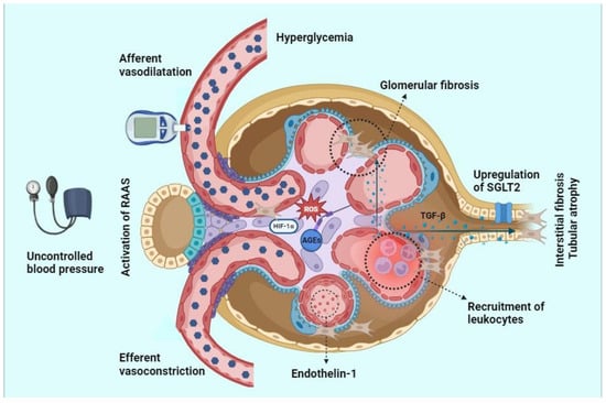 DKD is a complex disease driven by a series of disrupted metabolic, hemodynamic, inflammatory, and fibrotic processes [5]. The pathogenetic mechanisms are triggered and propagated by hyperglycemia and high blood pressure. Downstream effects triggered by these disturbances contribute to oxidative stress and the subsequent release of proinflammatory and profibrotic mediators [7]. The complex crosstalk of underlying mechanisms drives DKD onset and progression.
