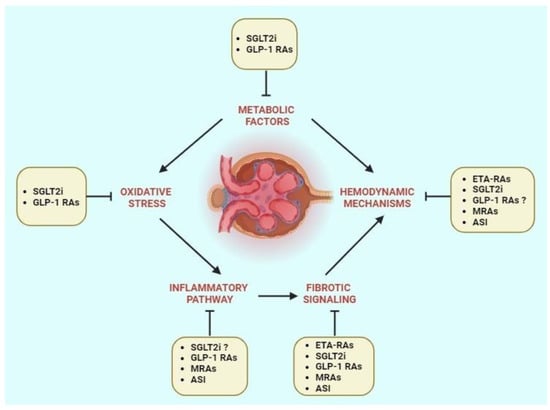 The interplay of different processes (metabolic factors, oxidative stress, inflammatory pathway, fibrotic signaling, and hemodynamic mechanisms) are therefore the drivers to the onset and progression of DKD (Figure 1).