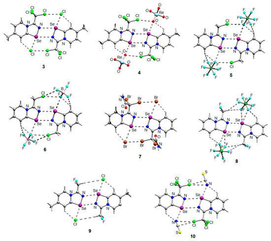 The crystal quality for 6 did not allow us to establish precise metrical parameters, but confirmed the atom connectivity in the solid state. Structural analysis revealed that for 3–10, the anion was involved in Se···X and H···X bifurcated non-covalent interactions (Figure 1). This robust chalcogen-bonded supramolecular synthon was described by us earlier [44,45,46]. Importantly, all the α-haloalkyl-substituted pyridinium-fused 1,2,4-selenadiazoles 3–10 exclusively form supramolecular dimers via four-center Se···N ChB (Figure 1) without an exception. Trichloromethyl-substituted 1,2,4-selenadiazoles 3 and 4 feature two antiparallel XB interactions Cl···Cl (for 3) or Cl···OReO3 (for 4, Figure 1). Chloromethyl-substituted derivatives 5 (PF6 salt) and 6 (BF4 salt) apart from four-center Se···N ChB exhibit Cl···F XB and Se···F ChB. 2,2-Dibromo-2-cyanoacetamide-derived pyridinium-fused 1,2,4-selenadiazole bromide 7 also exhibited four-center Se···N ChB together with the peripheral Br···Br interactions (Figure 1).