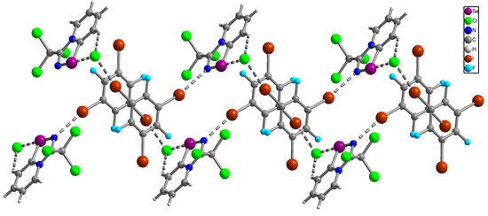 X-ray analysis revealed that in the solid of 12 Se2N2 supramolecular dimers are broken (Se···N distances of 5.82 Å are too long for ChB). However, Se···Cl and H···Cl bifurcated non-covalent interactions between the heterocycle and the Cl anion are conserved demonstrating again the robustness of this supramolecular synthon. Moreover, 12 contains supramolecular 1D infinite chains consisting of alternating selenadiazole···Cl ion pairs and C6F3I3 molecules (Figure 3), which are interconnected by I···N and I···Cl XB. Thus, in the resulting solid 12 Se2N2 supramolecular dimers were disrupted, indicating that the formed I···N and I···Cl XB interactions involving C6F3I3 molecules were collectively more significant than ChBs and HBs, which is confirmed by the results of DFT calculations and topological analysis of the electron density distribution within the framework of Bader’s theory (QTAIM analysis) [47] for model supramolecular associates (see properties and estimated strengths of such contacts in Table 1 and Table 2).