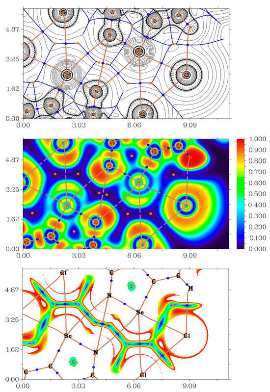 Contour line diagram of the Laplacian of electron density distribution ∇2ρ(r), bond paths and selected zero-flux surfaces (top panel), visualization of electron localization function (ELF, center panel) and reduced density gradient (RDG, bottom panel) analyses for H···Cl, Se···N, Se···C and Cl···Cl non-covalent interactions in 3. Bond critical points (3, −1) are shown in blue, nuclear critical points (3, −3) in pale brown, ring critical points (3, +1) in orange, bond paths are shown as pale brown lines, length units on axis is Å and the color scale for the ELF and RDG maps is presented in a.u.