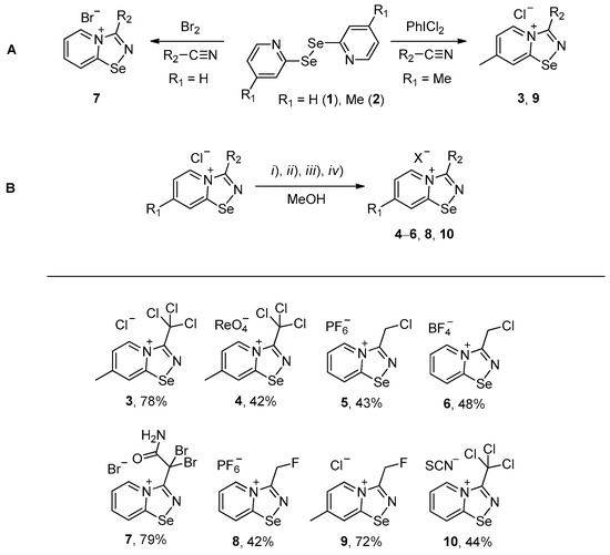 Halides of α-haloalkyl-substituted pyridinium-fused 1,2,4-selenadiazoles were obtained by the oxidation of 2,2′-dipyridyl diselenide 1 or 4,4′-dimethyl-2,2′-dipyridyl diselenide 2 followed by sequential cyclization of in situ generated 2-pyridylselenyl halide or 4-methyl-2-pyridylselenyl halide with corresponding α-haloalkylnitriles (Scheme 1A, see experimental part for details). The salts of ReO4−, PF6−, BF4− and SCN− were obtained via anion metathesis in 1,2,4-selenadiazolium chlorides (Scheme 1B).