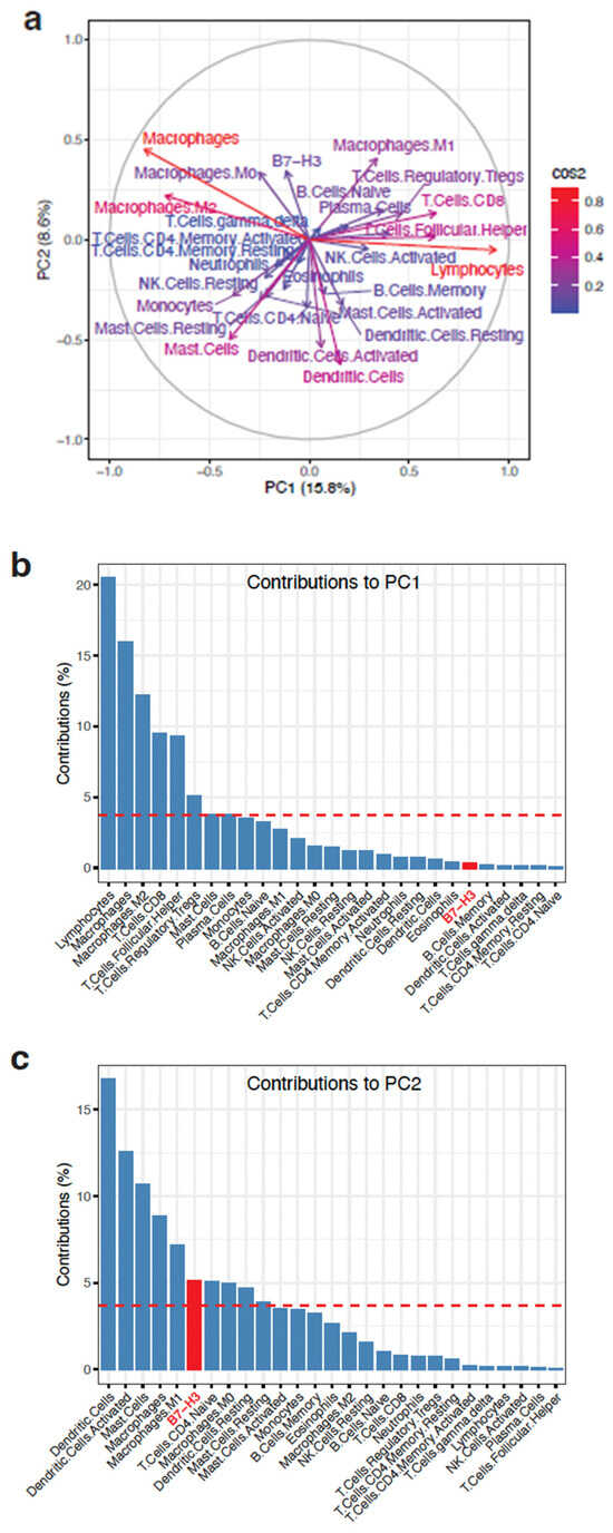 Principal component analysis of B7-H3 expression and infiltrated immune cell types. (a) PCA showing the contributions of the respective infiltrated immune cell types or states and B7-H3 to the first two principal components (PC1 and PC2). Colours of the arrows for each variable are proportional to square cosine (cos2), showing the degree of representation of the variables to PC1 and PC2. (b,c) Decomposition of PC1 (b) and PC2 (c) showing the contributions of each of the variables. The dotted horizontal line indicates the contribution level if all variables had uniformly contributed. B7-H3 is highlighted in red.