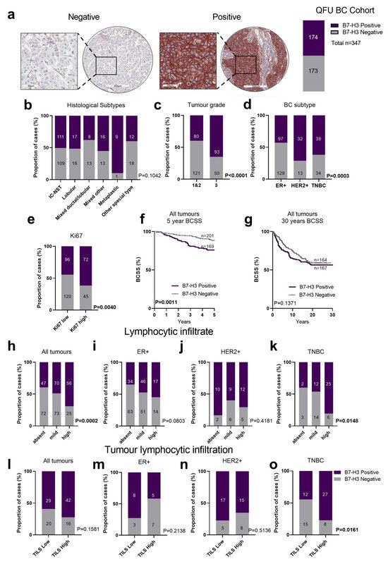 We next investigated the association of B7-H3 expression with immune features within our cohort. We scored immune features in two ways: (i) the extent of infiltration of lymphocytes across the tumour (classified as absent, mild, or high); and (ii) according to the International Working Group [32], which defines TILs as being within the stroma of the tumour, and tumours are classified as “TILs Low” or “TILs High”, reflecting <20% or >20% lymphocytic infiltration, respectively. For the three-tier classification, B7-H3 positivity was significantly associated with high lymphocytic infiltration in unselected breast cancers (Figure 2h, p = 0.0002, Chi-square) and TNBC (Figure 2k, p = 0.0148, Chi-square), but not within ER+ (Figure 2i) and HER2+ cases (Figure 2j). In the two-tier classification, B7-H3 positivity was more frequent, but not significantly associated with the TILs High group in unselected cases (Figure 2l), and was significantly associated with TILs High in the TNBC subtype (Figure 2l–o, p = 0.0161, Chi-square).