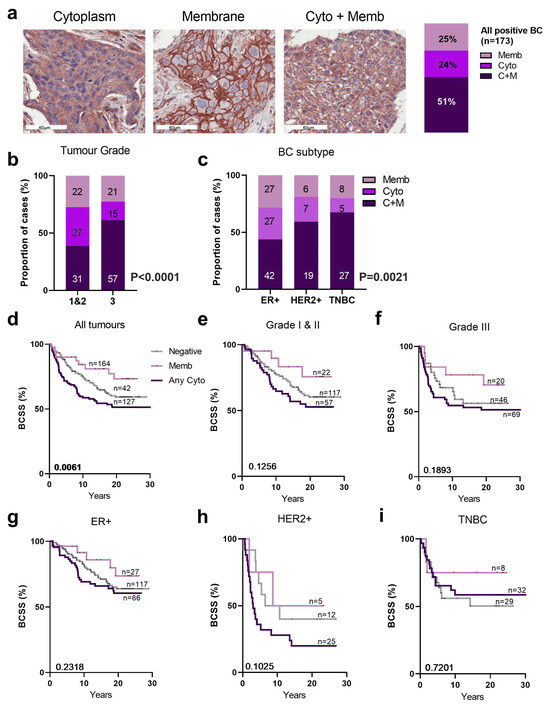 Subcellular localisation of B7-H3 in QFU cohort. (a) Representative immunohistochemistry images highlighting membrane (memb), cytoplasmic (cyto), and cytoplasmic + membrane (C+M) B7-H3 expression. B7-H3 expression localised in membrane, cytoplasm, or both (C+M) (24.3%, 24.9%, and 50.9% respectively). (b) Chi-square analysis of the proportion of breast cancer cases with membrane (memb), cytoplasmic (cyto), and cytoplasmic + membrane (C+M) B7-H3 expression by tumour grade and (c) breast cancer subtypes (ER+, HER2+, TNBC; right). KM analysis of (d) all tumours, (e) tumour grade 1 and 2, and (f) Grade 3, stratified by B7-H3 membrane vs. all cytoplasmic expression and BCSS. KM analysis of breast cancer subtype ER+ (g), HER2+ (h), and TNBC (i) stratified by B7-H3 membrane vs. cytoplasmic expression and BCSS. BC, breast cancer; BCSS, breast cancer specific survival; cyto, cytoplasmic; C+M, cytoplasmic + membrane; ER+, oestrogen receptor positive; HER2+, human epidermal growth factor receptor 2; memb, membrane; TNBC, triple negative breast cancer. Scale bar = 60 µm.