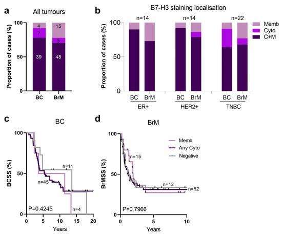 In the BrM cohort, the most prevalent B7-H3 staining pattern was C+M, with similar proportions across both the primaries (78%) and brain metastases (70%) (Figure 5a). For the matched cases stratified according to breast cancer subtype (ER+, HER2+, TNBC), we observed an equal proportion of cases with C+M B7-H3 expression and that membrane-only expression increased in the BrM cases in each subtype (Figure 5b). BC and BrM cases stratified by B7-H3 localisation did not show a significant association with survival for either BCSS (Figure 5c) or BrMSS (Figure 5d).
