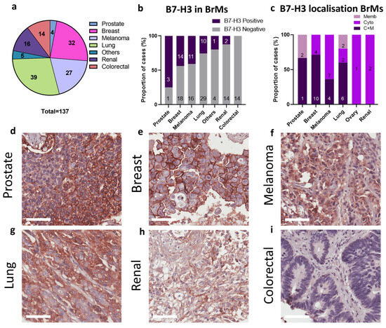 We subsequently investigated B7-H3 expression in an independent brain metastasis cohort, with metastases originating from a variety of primary tumours: prostate, breast, melanoma, lung, renal, colorectal cancer, ovary, neuroendocrine, and adenoid cystic carcinoma; Figure 6a. In this independent cohort, we observed B7-H3 expression in 44% of breast-derived BrMs (Figure 6b), lower than that of our QBBM cohort (90%); however, we have no clinicopathology data for these heavily pre-treated samples and cannot further investigate. We also observed B7-H3 expression in BrMs from prostate, lung, and melanoma primaries but no B7-H3 expression was found in colorectal BrMs (Figure 6c–h), and a low frequency of staining was recorded for renal carcinoma-derived BrMs. As for the QBBM cohort, the most prevalent B7-H3 staining pattern for the independent brain metastasis cohort was C+M in breast to brain metastases (71%; Figure 6c). This was also the case for prostate (C+M, 67%), melanoma (C+M, 36%), and lung (C+M, 60%) (Figure 6c).