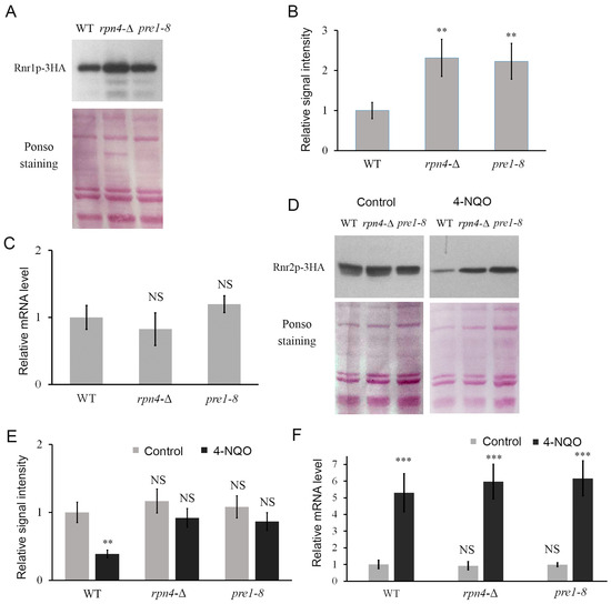 We have previously shown that Rnr1p is a substrate of the proteasome [23], which is evidenced by an increase in the content of Rnr1p under the action of the proteasome inhibitor bortezomib or in a mutant strain with reduced proteasome activity due to decreased expression of the PRE1 gene encoding an essential structural subunit of the proteasome (called pre1–8). In the present study, Western blot analysis showed that in the mutant strain rpn4-Δ with the deletion of the RPN4 gene, which encodes a key transcriptional regulator of proteasomal genes [45,46,47], an increase in the level of the large catalytic subunit of ribonucleotide reductase Rnr1p was also observed under normal conditions (Figure 1A,B), while the level of RNR1 mRNA did not change significantly (Figure 1C). In addition, we confirmed that treatment with the DNA-damaging compound 4-nitroquinoline-1-oxide (4-NQO) resulted in an increased content of the small regulatory subunit Rnr2p in rpn4-Δ and pre1–8 strains (Figure 1D,E), while the level of RNR2 mRNA upon 4-NQO induction was not significantly different in all strains (Figure 1F). We have previously shown that Rpn4p is involved in the direct regulation of the expression of some genes of DNA repair systems [21,22]. The results indicate that Rpn4p does not affect RNR genes expression. In addition, the results indicate that under conditions of DNA-damaging stress, the ubiquitin–proteasome system is involved in the control of Rnr2p levels.