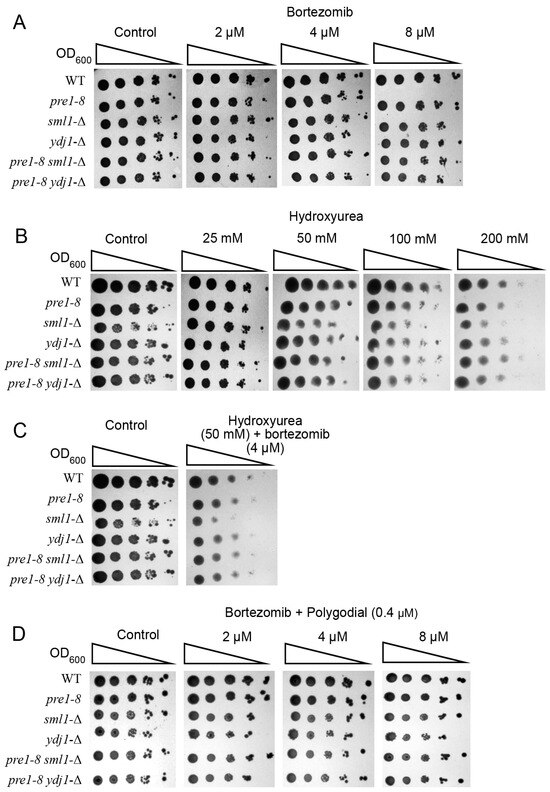 Evaluation of yeast strains’ resistance to the proteasome inhibitor bortezomib (A), the RNR inhibitor hydroxyurea (B), the combination of inhibitors (C) (the control images for panels B and C in Figure 3 are identical) (D) and the combination of bortezomib and polygodial, a cell permeabilizing agent.