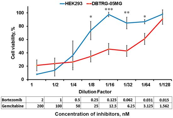 Survival of HEK 293 and DBTRG-05MG cell lines upon treatment with a combination of proteasome and RNR inhibitors. The data in the table represent the concentration of inhibitors in the corresponding dilution. Data represent mean ± SD (n = 3). Statistical significance: * 0.01 < p < 0.05, ** 0.001 < p < 0.01, *** p < 0.001, according to Student’s t-test.