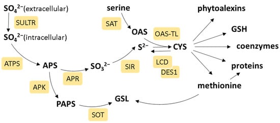 The scheme of plant sulfate assimilation. The enzymes of S metabolism are in light-yellow rectangles and are as follows: sulfate transporter (SULTR), ATP sulfurylase (ATPS), adenosine 5′-phosphosulfate reductase (APR), sulfite reductase (SIR), serine acetyltransferase (SAT), O-acetyl-thiol-lyase (OAS-TL), cysteine desulfhydrase (LCD, DES), APS kinase (APK), and sulfotransferase (SOT). The metabolites in the scheme are as follows: 5′-phosphosulfate (APS), 3′-phosphoadenylylsulfate (PAPS), O-acetylserine (OAS), cysteine (CYS), glutathione (GSH), and glucosinolates (GSLs). Refer to the text for a detailed description.
