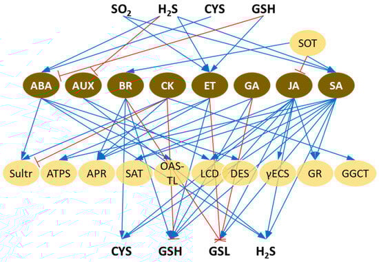 The interplay of sulfur (S) and phytohormones. The enzymes of S metabolism are in light-yellow circles and are as follows: sulfotransferase (SOT), sulfate transporter (Sultr), ATP sulfurylase (ATPS), adenosine 5′-phosphosulfate reductase (APR), serine acetyltransferase (SAT), O-acetyl-thiol-lyase (OAS-TL), cysteine desulfhydrase (LCD, DES), γ-glutamylcysteine synthetase (γECS), glutathione reductase (GR), and γ-glutamylcyclotransferase (GGCT). The phytohormones are in brown circles and are as follows: abscisic acid (ABA), auxin (AUX), brassinosteroids (BR), cytokinins (CK), ethylene (ET), gibberellic acid (GA), jasmonic acid (JA), and salicylic acid (SA). The S-containing metabolites that either regulate phytohormone levels or are affected by them are as follows: sulfur dioxide (SO2), hydrogen sulfide (H2S), cysteine (CYS), glutathione (GSH), and glucosinolates (GSLs). Positive and negative effects are indicated by blue and red lines, respectively. Refer to the text for a detailed description.