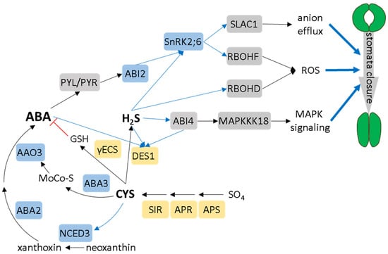 Model depicting the role of sulfur (S) metabolism in abscisic acid (ABA) biosynthesis and the regulation of stomatal closure. Enzymes catalyzing reactions (black arrows) in S metabolism are shown in yellow boxes (ATP sulfurylase (APS), adenosine 5′-phosphosulfate reductase (APR), sulfite reductase (SIR), cysteine desulfhydrase (DES), γ-glutamylcysteine synthetase (γECS)), while enzymes of ABA synthesis and signaling for stomatal closure are shown in blue boxes. The stimulating effects of metabolites or enzymes on downstream reactions are depicted as blue arrows, while red ones indicate a negative impact. Cysteine (CYS) synthesis is limited by sulfate availability, and it affects abscisic aldehyde oxidase (AAO3) activity, serving as the S donor to its cofactor (MoCo-S) in the reaction catalyzed by a sulfurase called ABA3. Moreover, elevated levels of cysteine boost the transcription of 9-cis-epoxycarotenoid dioxygenase 3 (NCED3), thereby augmenting the availability of the substrate precursor for AAO3. PYR/PYL acts as an ABA receptor and regulates ABI2 phosphatase activity, which, in turn, activates SnRK2;6 kinase. SnRK2;6 phosphorylates RBOHF oxidase and activates the anion transporter SLAC1 by phosphorylation at multiple residues []. H2S produced from cysteine is needed for protein persulfhydration, positively affecting their activity (RBOHD oxidase and ABA-INSENSITIVE 4 transcription factor (ABI4)). Oxidative burst and ROS production, together with anion efflux, are necessary for stomatal closure.
