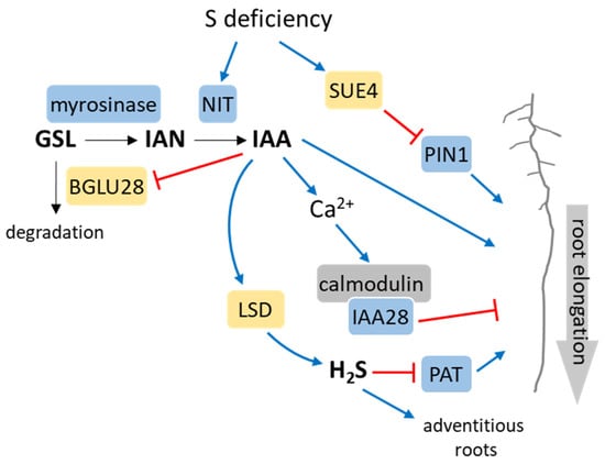 A model linking the response to S deficiency with the auxin role in primary root elongation. In yellow are enzymes of S metabolism: β-glucosidase 28 (BGLU28), L-cysteine desulfhydrase (LSD), and SULFATE UTILIZATION EFFICIENCY 4 (SUE4). In blue are proteins of auxin metabolism: nitrylase (NIT), INDOLE-3-ACETIC ACID INDUCIBLE 28 (IAA28), auxin efflux carrier PIN1 (PIN1), and polar auxin transport (PAT). Other abbreviations are as follows: glucosinolates (GSLs), indole-3-acetonitrile (IAN), and indole-3-acetic acid (IAA). Positive and negative effects are indicated by blue and red lines, respectively. Refer to the text for a detailed description.