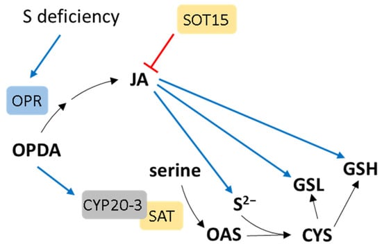 The mutual regulation of S metabolism and jasmonic acid biosynthesis and signaling. S deficiency activates the expression of 12-oxophytodienoate reductase (OPR), leading to higher JA levels. This positively impacts the levels of sulfide, glutathione (GSH), and glucosinolates (GSLs). 12-Oxo-phytodienoic acid (OPDA) binds to cyclophilin CYP20-3, thus stimulating its binding to serine acetyltransferase (SAT) to activate O-acetylserine (OAS) production. The sulfotransferase SOT15 inactivates JA through sulfation. Positive and negative effects are indicated by blue and red lines, respectively.
