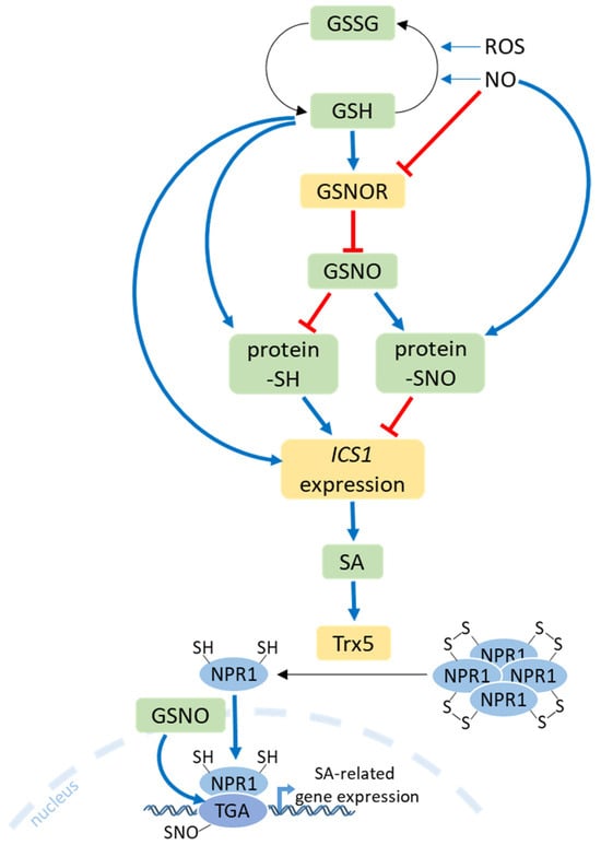 The glutathione (reduced/oxidized form, GSH/GSSG)-mediated regulation of the plant hormone salicylic acid (SA) through the expression of isochorismate synthase (ICS1). The generation of reactive oxygen species (ROS) and nitrogen oxide (NO) during plant defense alters the GSH/GSSG ratio. NO inhibits while GSH activates S-nitrosoglutathione reductase (GSNOR), which catalyzes the degradation of S-nitrosoglutathione (GSNO). The breakdown of GSNO results in the decreased formation of protein-SNO, thereby preserving protein-SH groups, which activates the increased expression of ICS1 and the synthesis of SA. Furthermore, NO accumulating during the initial stages of plant defense can react with GSH to produce GSNO, which, in turn, suppresses the accumulation of SA. The accumulation of SA triggers the expression of defense genes by causing conformational changes in the NON-EXPRESSOR OF PATHOGENESIS-RELATED 1 protein (NPR1). Alterations in the redox state of plant cells cause the reduction of the cysteine residues within NPR1, leading to the release of NPR1 monomers from the tetrameric complex, catalyzed by thioredoxins (TRXs). Activated NPR1 monomers are translocated to the nucleus, mediated by GSNO. The activated NPR1 monomer interacts with TGA transcription factors to induce the expression of SA-related genes, while the S-nitrosylation of TGA, facilitated by GSNO, further increases gene expression. Positive and negative effects are indicated by blue and red lines, respectively.