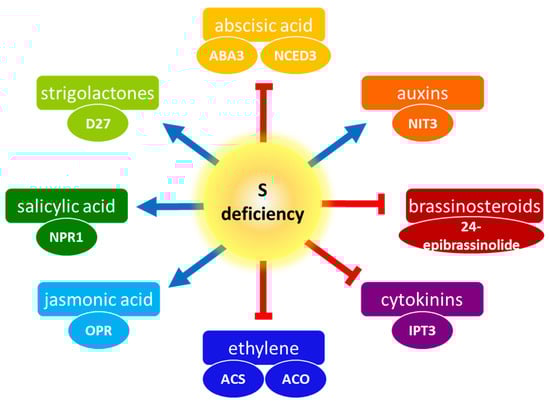 S nutrition plays a crucial role in the growth and development of plants, influencing their response to both biotic and abiotic stresses, as well as the yield and quality of crops. The gradual emergence of S deficiency in soils has become a significant factor limiting plant growth and crop yields. Despite its importance, there is currently insufficient research on plant S nutrition compared to other macronutrient elements. A comprehensive understanding of the regulation of S nutrition in plants, especially the role of phytohormones in this process, is still elusive. Currently, phytohormones are recognized as pivotal targets for enhancing both plant productivity and stress tolerance, exerting a significant influence on the yield and quality of crop plants. The current review underscores the significance of S in the regulation of phytohormone-mediated responses. It appears that S is a vital requirement for phytohormones to perform optimally. A brief summary of the influence of S deficiency on plant hormones is depicted in Figure 7. Further exploration into the molecular genetics of these aspects would be intriguing and valuable for a deeper understanding. It is also necessary to examine the influence of S availability on yet other important phytohormones—polyamines and peptide hormones—or the effect of these phytohormones on S metabolism, as this field is understudied. Therefore, there is a pressing need for more extensive research to unravel the mechanisms behind the plant’s response to S-deficiency stress, including phytohormonal signaling. Such insights will serve as a foundation for enhancing S utilization efficiency in crops.