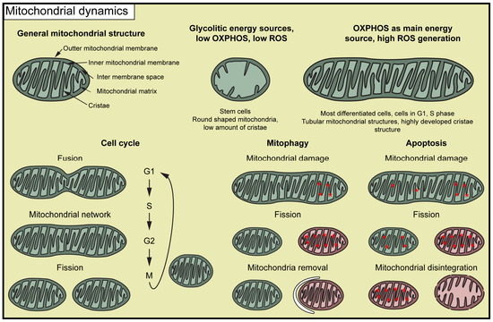 The dynamical changes between mitochondrial morphology and function are observable during the cell cycle [3]. The initially fragmented mitochondria start to form a mitochondrial network at the end of the G1 and S phases. This is believed to ensure the energy requirements for the replication of DNA and cell cycle progression. The mitochondrial network becomes fragmented during the M phase; therefore, they could be evenly distributed between the daughter cells [3]. Mitochondrial segmentation also occurs under stress conditions, which can trigger mitophagy or apoptosis [4,5] (Figure 1).