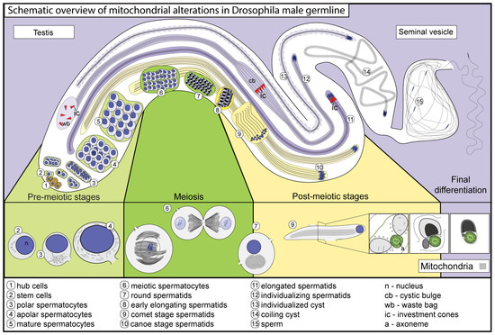 Mitochondrial activity in spermatogenesis and in sperm function is essential, where the differentiation of mitochondria during spermatogenesis includes changes in morphology and molecular components [6]. During Drosophila melanogaster spermatogenesis, intensive mitochondrial dynamics are observable throughout various stages of development, starting from the initial steps of germline stem cell (GSC) differentiation to the final differentiation of sperm cells (Figure 2). During mammalian spermatogenesis, the mitochondrial structure undergoes a significant reorganization that is unique to each stage of meiosis [7,8]. Mitochondrial fission and fusion events, along with changes in the cristae structure, are observed in spermatogonia and spermatocytes, resembling the characteristics found in somatic cells [2,7]. Mitochondrial differentiation in Drosophila spermatids results in one of the most extreme mitochondrial forms observable in nature: where two mitochondrial derivatives elongate with the spermatid tail, reaching approximately 1.8 mm in length. In elongating Drosophila spermatids, two tubular mitochondrial derivatives run along the entire length of the tail, modulating the elongation process of the cyst [9]. In the mature sperm, one of the derivatives is filled with electron-dense paracrystalline material, while the other derivative loses the majority of its volume, yet is present in the giant mature sperm tail [10,11]. These structural and functional alternations are spectacular in many aspects; nevertheless, the molecular and functional differences between the two mitochondrial derivatives are barely known. In this review, we summarize the changes in mitochondrial morphology during Drosophila spermatogenesis and highlight the molecular components and the structural changes required to establish the specialized mitochondria of the sperm.