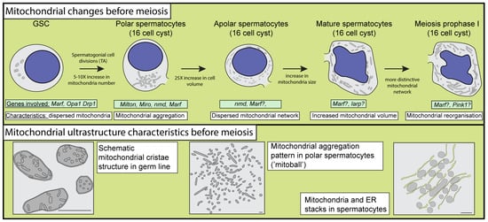 In the apolar spermatocytes, the mitochondria disperse in the cytosol and the mitochondrial number increases [10,11]. In a mature 16-cell cyst, mitochondrial structures become interconnected with the endoplasmic reticulum and the size of mitochondria is slightly larger than in the apolar spermatocytes [10,25]. Drp1 is required for normal mitochondrial distribution at this stage [28].The presence of a more structured mitochondrial organization in mature spermatocytes is a hallmark of the initiation of meiotic divisions. The arrangement of mitochondria in mature spermatocytes undergoes a significant reorganization before the commencement of meiotic divisions. This reorganization manifests in the formation of parallel structures, characterized by the alignment of rod-like mitochondria in a parallel fashion [10].