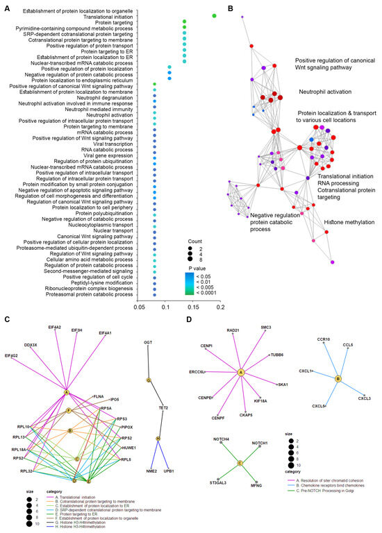 Gene ontology (GO) enrichment analysis for significant biological processes associated with positive SLNs. (A) The dot plot graph shows the 50 most significant biological process GO terms (y-axis) and the ratio between the number of expressed sncRNAs associated with the GO term and the number of significantly differentially expressed genes associated with the GO term (x-axis). The color of the nodes indicates the p value and the size of the nodes the number of sncRNAs associated with a specific GO term. (B) Enrichment map of the top 60 sncRNAs, with pathways grouped by similarity. Node size indicates the number of sncRNAs found in a pathway and node color reflects the significance of the p value. (C,D) The neural plots show the link between genes and terms associated with the most significant GO terms or Reactome pathways, respectively.