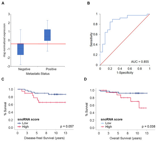 Classifier model and association with patient outcome. (A) Boxplot shows the normalized expression of the snoRNA score (y-axis) and the metastatic status of patients. The red line indicates the cutoff value. (B) ROC curve analysis of the snoRNAs score for discriminating patients with locoregional metastasis (blue). The reference line for random classification is shown in red. (C,D) Kaplan–Meier survival curves and log-rank tests for disease-free survival and overall survival based on snoRNAs categorized as low or high expression.