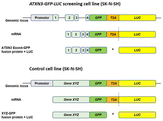 Reporter cell line-based compound screening for modulators of ATXN3 expression modulating drugs. Schematic overview of CRISPR/Cas9 genome editing-based generation of ATXN3-GFP-LUC screening and control cell lines. The integration of a GFP-T2A-LUC cassette under the endogenous promotor of ATXN3 enabled a fast and efficient readout for modulators of transcription levels. Translation of the mRNA results in an ATXN3-Exon4-GFP fusion protein and a functional LUC enzyme that are separated by a ribosomal skipping event mediated through the T2A sequence. The control cell line served as a specificity control to exclude unspecific modulators.