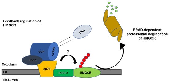 Despite the above-mentioned implications of cholesterol synthesis or turnover in SCA3, none of the studies has yet identified a potential function of ATXN3 in cholesterol homeostasis, although ATXN3 is likely a SREBP1 regulated gene and may play a (yet) unknown role in the SREBP dependent regulation of cholesterol homeostasis []. HMGCR, the key enzyme in cholesterol homeostasis, is an ERAD-dependent substrate and is degraded under high cholesterol conditions. Ubiquitination of HMGCR is initiated via the binding of INSIG, which in turn is associated with VCP/p97, the ubiquitin-conjugating enzyme E2 (Ubc7) and glycoprotein 78 E3 ubiquitin ligase (gp78) [].
