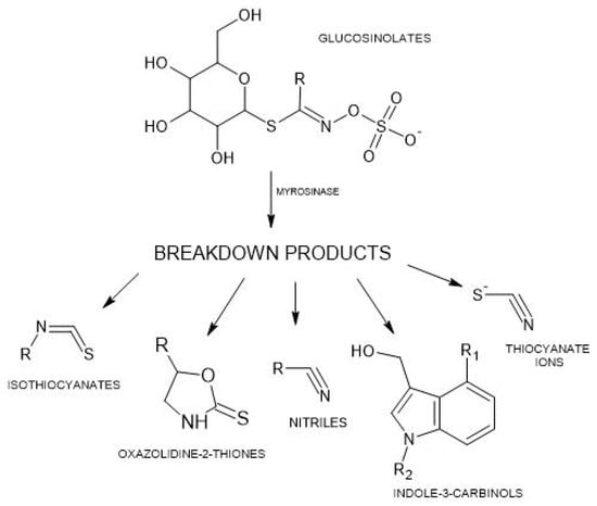 The key active secondary metabolites in brassica vegetables, most often associated with antithyroid/goitrogenic effects, are sulfur compounds: glucosinolates (GLSs) and their derivatives, such as isothiocyanates (ITCs) and thiocyanates. GLSs present in brassica plants can be categorized into two groups: aliphatic, including well-known examples such as sinigrin, glucoiberin, glucoraphanin, gluconapin, and progoitrin; and indole, represented by glucobrassicin []. Typically, a single plant species contains up to four different GLSs in substantial quantities. The average amount of total GLSs in root vegetables is 28–330 mg/100 g fresh weight (FW), while in leafy vegetables, it ranges from 10–110 mg/100 g FW []. Upon ingestion, some GLSs are absorbed intact through the gastrointestinal lining, while the majority undergo metabolism within the gut. When raw brassica vegetables are chopped or eaten, the myrosinase enzyme is released from the damaged plant tissues, resulting in the breakdown of the GLSs into various metabolites, including ITCs, nitriles, oxazolidine-2-thiones, and indole-3-carbinols (Figure 1). Conversely, cooking vegetables deactivates myrosinase, allowing intact GLSs to reach the colon, where they are broken down by intestinal bacteria [].