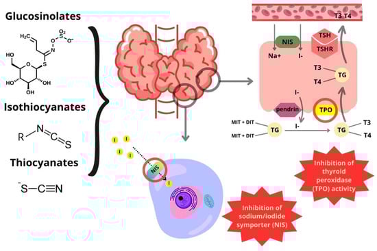 It is known that GLSs and their derivatives are potentially responsible for negative effects on thyroid function via the inhibition of the sodium/iodide symporter (NIS) in the basolateral membrane of the thyroid cells and thyroid peroxidase (TPO) activity (Figure 3).