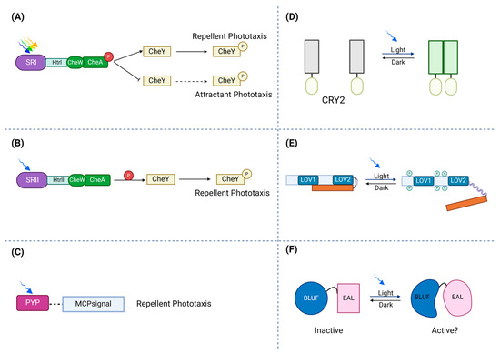 Schematic illustration of photoreceptors’ response to light. (A) In the activation of the ion pumps, photo-attractant sensory rhodopsin I (SRI) absorbs light (green to orange range) and causes an attractant phototaxis response. (B) To protect against dangerous UV radiation, photo-repellent sensory rhodopsin II (SRII) absorbs blue light and triggers a repellent phototaxis response. (C) By attaching to membrane-bound chemoreceptors, which lack sensory domains, PYPs may control phototaxis. (D) Transmembrane receptors, cryptochrome 2 (CRY2), can be fused to photosensitive proteins. Via blue light exposure, a conserved N-terminal photolyze homology region of cryptochrome 2 can homo-oligomerize. (E) In the dark state, the phototropin receptor is unphosphorylated and inactive. Light absorption by LOV2 disorders the Jα-helix and activates the C-terminal kinase domain, which leads to autophosphorylation of the photoreceptor. (F) The absorption of light causes a structural change in the rim enclosing the hook, modifying the protein interface between BLUF and the output domain.