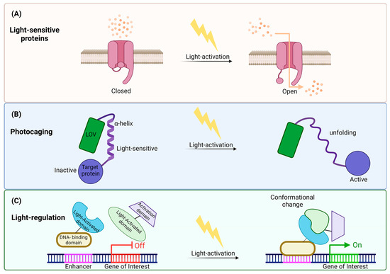 The second approach is light control (Figure 3), a rapidly developing technique, which can control biological processes using light [23,65]. By inserting light-sensitive proteins into cells [66], precise regulation of gene expression and cellular functions, as well as temporal and spatial control, can be accomplished through this technique [67,68,69].